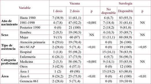 Considerando las variables laborales, se obtuvieron diferencias en función del tipo de asistencia, tanto en datos de vacuna (p<0,05) como de serología (p<0,001), habiendo más datos de los trabajadores de hospitales (disponibles datos de vacunación del 27,3% y de serología del 45.4%). Son interesantes las diferencias según categoría profesional (p<0,001 y p<0,01 respectivamente) pues se disponían de más datos de vacunas (30,6%) del personal médico, pero más serologías del personal de enfermería (32,7%). Hubo diferencias tanto en la disposición de datos de vacunas (p<0,05), como de datos de serología (p<0,001), según el tipo de asistencia, habiendo más datos del personal de hospital (45,4%). Según las áreas donde trabajan, se obtuvieron más datos de forma significativa (p<0,001) del área1, con un 36,5% de datos de vacuna, y un 56,9% de datos de serología (tabla 2).