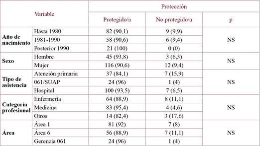 Por último, se sumaron estos dos aspectos, y se comprobó si había diferencias según las variables sociodemográficas y/o laborales en la protección frente a sarampión, no obteniendo resultados significativos en ningún caso (tabla 5).