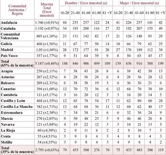 Los encuestados fueron seleccionados de manera aleatoria siguiendo dos pasos: en primer lugar, con la ayuda del sistema CATI (entrevistas telefónicas informatizadas), el cual contaba con una base de datos de números de teléfono elegidos al azar. En el segundo paso se seleccionó una persona de ese núcleo familiar dispuesta a tomar parte de este muestreo. Se realizaron diferentes llamadas hasta conseguir que los grupos por sexo y edad fueran completados en todas las regiones a lo largo de España (Ver tabla 2).