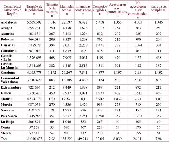 Para obtener representación de todas las comunidades autónomas y ciudades de España (Andalucía, Aragón, Asturias, Islas Baleares, País Vasco, Islas Canarias, Cantabria, Castilla y León, Castilla La Mancha, Cataluña, Ceuta, Extremadura, Galicia, La Rioja, Madrid, Melilla, Murcia, Navarra y la Comunidad Valenciana), el tamaño de la muestra se calculó para determinar el número mínimo de entrevistas que se necesitaban por cada región y sexo; se establecieron arbitrariamente 5 grupos de edades: 16-20; 21-40; 41-60; 61-80; y mayores de 80 años. Debido a que las comunidades autónomas y las ciudades en España son independientes en cuanto al control de los recursos sanitarios, era muy importante unificar los datos epidemiológicos.