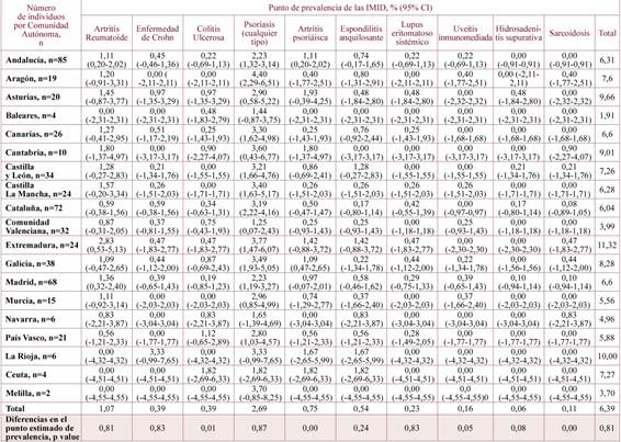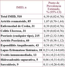 Conclusions: The overall prevalence was of the IMID studied was 6.39%, psoriasis being the most frequent with 2.69%. This study constitutes an initial step to consider IMID as an independent disease within the health system.