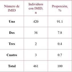 Results: Of the 7,980 respondents, 510 were diagnosed with an IMID, representing a cross-sectional study of 6.39% (95% CI: 6.02-6.76). One, two, three or more members of the family were affected in 87.2%, 7.8% and 5% of positive relatives in IMID, respectively. The most recurrent diseases were psoriasis (2.69% 95% CI: 2.32-3.06) and rheumatic arthritis (1.07% 95% CI: 0.70-1.44). There were differences in prevalence due to sex (p = 0.004) and age (p = 0.000). No significant differences were identified related to geographic location (p = 0.819). Attendance of at least 2 IMID was reported in 8.9% of respondents.