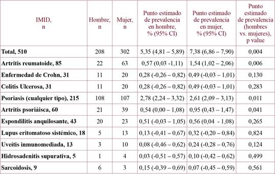 Se reportaron 208 hombres y 302 mujeres con un diagnóstico de una IMID, lo que representa un punto de prevalencia por sexo del 5,35% (95% ci: 4,81-5,89) y 7,38% (95% ci: 6,86-7,90) respectivamente. Se encontraron diferencias significativas por sexo en la muestra estudiada (p=0,004) (tabla 5).