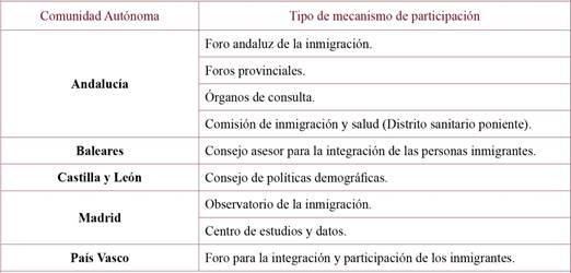 La primera cuestión que se les planteó fue qué mecanismos de participación ciudadana en salud disponían en la región. El 95% de las comunidades autónomas declararon disponer de servicios de participación ciudadana, siguiendo el desarrollo contemplado en la vigente Ley General de Sanidad (Ley 14/1986) y adaptados a cada normativa autonómica. Se identificaron cinco comunidades autónomas (Andalucía, Baleares, Castilla y León, Madrid y País Vasco) que contemplaban específicamente la participación de los inmigrantes en consejos, foros, comisiones u observatorios (ver tabla 1): 1/ Andalucía: Foro Andaluz de la Inmigración y los foros provinciales. Integra varios órganos de consulta, representación y participación en el ámbito de la política social para inmigrantes y la diversidad cultural. Sobresaliendo, entre todos ellos, la Comisión de Inmigración y Salud, del Distrito sanitario ponente, de Almería, en la que participan ayuntamientos, organizaciones no gubernamentales, asociaciones de inmigrantes y profesionales del sector sanitario. 2/ Baleares: Consejo Asesor para la integración de las personas inmigrantes de las Islas Baleares. Es un órgano adscrito a la Consejería de Servicios Sociales y Cooperación, donde participan representantes de varias administraciones, con el objetivo de asesorar en materia de integración de personas inmigrantes extranjeras, así como la promoción de la participación social. 3/ Castilla y León: Consejo de Políticas Demográficas, del que forman parte representantes de centros integrales de inmigración y de asociaciones de inmigrantes en el Grupo de trabajo de inmigración. Es un órgano consultivo y deliberante, y sirve como cauce de participación de diferentes instituciones relacionadas con las políticas de población, de integración de los inmigrantes y de emigración. 4/ Madrid: Observatorio de Inmigración-Centro de estudios y datos. Una de sus actuaciones concretas es el barómetro de inmigración, donde se recogen las actitudes, creencias y percepciones de la población acerca de las relaciones entre la población autóctona y la foránea, entre ellas las relacionadas con el uso de los servicios de salud. 5/ País Vasco: Foro para la integración y participación social de las ciudadanas y los ciudadanos inmigrantes. Uno de sus ejes es la participación social, diversidad cultural y convivencia, poniendo especial atención al impulso de espacios de encuentro, reconocimiento y convivencia entre grupos y personas de orígenes diversos.