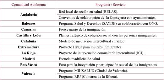 El 89% de las comunidades atienden la salud de los inmigrantes con programas específicos para ellos, sobre todo los relacionados con la salud pública. Andalucía, Baleares, Canarias, Castilla y León, Castilla-La Mancha, La Rioja, Madrid, País Vasco y Comunidad Valenciana pusieron en marcha, junto a otras organizaciones públicas y privadas, servicios y programas específicos para el colectivo de los inmigrantes, que van desde la atención sanitaria a instrumentos que facilitan la participación activa de los mismos.