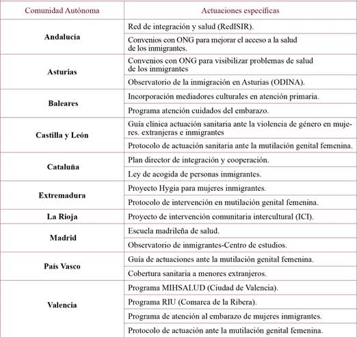 A excepción de Aragón y Melilla, todas las comunidades que han respondido al cuestionario declararon haber realizado actuaciones específicas para mejorar la salud de los inmigrantes. En concreto las relacionadas con: la atención sanitaria universal, la interpretación lingüística, la vigilancia epidemiológica y la formación de los profesionales. A lo que habría que añadir las llevadas a cabo por las comunidades de Andalucía, Asturias, Baleares, Castilla y León, La Rioja, Madrid, País Vasco y Comunidad Valenciana, que tienen establecidos espacios para identificar y visibilizar los problemas de salud de los inmigrantes, con el fin de abordarlos conjuntamente, facilitando redes participativas y colaborativas.