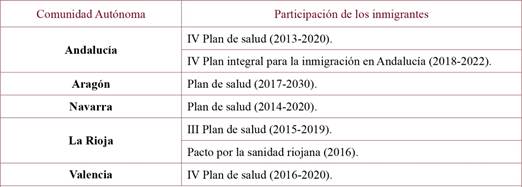 En los Planes de Salud de las comunidades autónomas se sigue sin contar con la participación activa de las personas inmigrantes, si bien hay que señalar que cinco de ellas sí que lo han hecho: Andalucía, Aragón, Navarra, La Rioja y Comunidad Valenciana, bien consultándolos para la elaboración del Plan de Salud o bien contemplándolos en las estrategias de implantación y desarrollo del mismo.