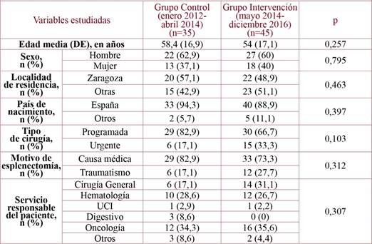 Entre las características de las esplenectomías, 62 (77,5%) fueron por causa médica, 59 (73,8%) se realizaron de forma programada, siendo los Servicios de Oncología (35%) y Hematología (27,5%) los responsables del mayor número de pacientes (tabla 1). Según el grupo no se detectaron diferencias significativas en ninguna de las características clínicas y sociodemográficas (tabla 1).