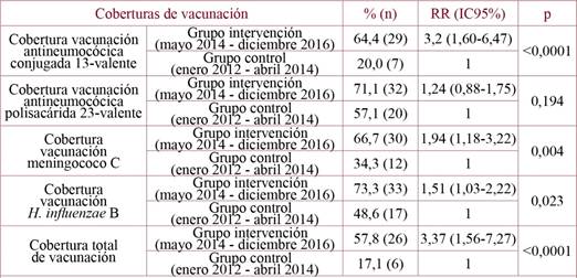 Métodos: Estudio cuasiexperimental. Constituyeron el grupo control los esplenectomizados entre enero 2012-abril 2014, y el grupo intervención los operados entre mayo 2014-diciembre 2016. Se compararon las coberturas vacunales global y específica para cada vacuna según grupo utilizando la prueba chi-cuadrado.