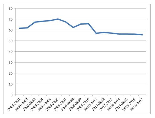 En relación con el primer objetivo, los resultados de este trabajo pusieron de manifiesto que desde 2006-2007 existía una tendencia decreciente del porcentaje de vacunación de la gripe y que era claramente diferente de la tendencia que alcanzó en el periodo 2000-2001 a 2005-2006. La campaña de vacunación 2000-2001 tuvo una cobertura del 61,5% de la población. Se observó un pico en el año 2005-2006, con un 70% de cobertura. En la campaña de 2016-2017, la cobertura fue de un 55,5%. Hasta la temporada de gripe 2005-2006, había una tendencia de aumento absoluto de vacunación de 1,8% puntos anuales (95% IC: 1,4%, 2,5%). A partir de ese año, existe una disminución absoluta en el porcentaje de vacunación de 1,2 puntos cada año (95% IC: 0,8%, 1,6%).
