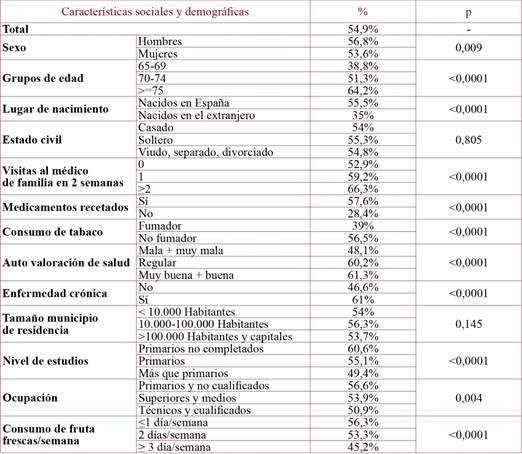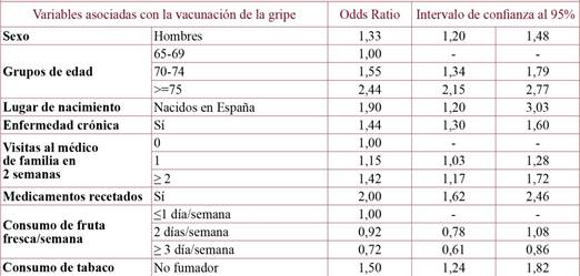 En el análisis multivariante (tabla 1) se observó que las variables que permanecían en el modelo y que estaban independientemente asociadas con la mayor probabilidad de vacunarse de la gripe eran ser mujer, la mayor edad, haber nacido en España, tener más visitas al médico, tener una prescripción de medicamentos, tener una enfermedad crónica, no ser fumador y el menor consumo de frutas.
