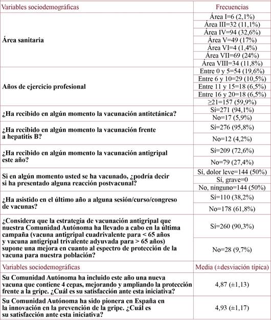 Inicialmente fueron registrados un total de 310 participantes de los cuales tuvieron que ser eliminados 22 por no haber contestado el 100% de las preguntas. Por tanto, el número total de participantes fue 288 (219 mujeres, 76%, y 69 hombres, 24%) y la tasa de respuesta fue del 24%. La media y desviación típica de la edad fue 45,57±12,63 con un rango de 22-65 años. El perfil de los encuestados fue el siguiente: 173 fueron del colectivo de enfermería (60,1%), 107 de Medicina (37,2%) y 8 de Farmacia (2,8%). El Área Sanitaria con mayor participación fue el Área IV con 94 sanitarios (32,6%), seguida del Área VII con 69 (24%). Más de un 90% de los participantes consideró que la nueva estrategia del Principado de Asturias incluyendo la vacuna antigripal cuadrivalente para < 65 años y la vacuna antigripal trivalente adyuvada para > 65 años representaba una mejora en cuanto al espectro de protección de la vacuna para la población general. El resto de los análisis descriptivos de las variables sociodemográficas se muestran en la tabla 1.