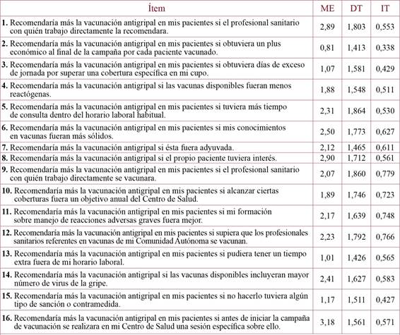 Results: The exploratory factor analysis yielded a 3-factor solution that explained 79.38% of the total variance. The ordinal alpha ranged from 0.72 to 0.80. The test-retest recorded a value of r=0.804 (p<0.001). There were no statistically significant differences when comparing according to sex (p=0.952), professional group (p = 0.563) or having received influenza vaccination in the last campaign (p=0.861). There were these differences when comparing the number of years of professional practice (p=0.003) and having received specific training in vaccines in the last year (p=0.004). More than 90% of the participants valued positively the influenza vaccination strategy of the Autonomous Community of study (quadrivalent vaccine for <65 years and adjuvant trivalent for ≥65 years).