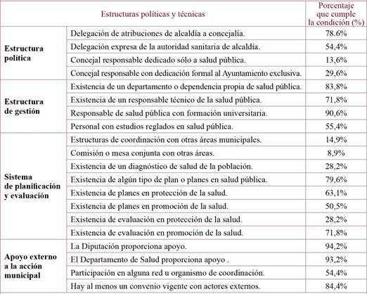 En la tabla 1 puede verse como estaban organizados los servicios de salud pública de los municipios a mediados de 2016. En el 79% de los Ayuntamientos la alcaldía había delegado las atribuciones de salud pública en una concejalía, y en un 54% había delegado expresamente la autoridad sanitaria. El concejal responsable de salud pública se dedicaba sólo a este tema en el 14% de los casos (habitualmente se dedica también a otras materias), y tenía dedicación exclusiva al Ayuntamiento en un 30% de los casos. En el 84% de los municipios había un departamento propio para salud pública, habitualmente con un responsable técnico que solía tener formación universitaria y en más de la mitad de los casos formación reglada en salud pública. Se aprecia que había estructuras de coordinación más estables y formales en pocos municipios, la mayoría decía que la coordinación con otros departamentos era puntual, según temas y problemas. Una cuarta parte había realizado algún tipo de diagnóstico de salud de su población. La mayoría disponía de planes, que eran más habituales en el ámbito de la protección de la salud. Los planes se evaluaban en algunos casos, más frecuentemente en lo que respecta a la promoción de la salud. Los municipios decían apoyarse en estructuras externas, y las fuentes de apoyo más mencionadas fueron la Diputación de Barcelona y el Departamento de Salud, además de Dipsalut en su demarcación. La mayoría tenía algún tipo de convenio activo con éstas u otras estructuras. Algo más de la mitad estaban presentes en algún organismo de coordinación o red.