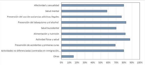 En la figura 2 se presentan las actividades que los municipios realizaban en el ámbito de la promoción de la salud. Las más extendidas eran las referidas a la actividad física y salud, a la prevención en tabaco y alcohol, y a la alimentación y nutrición, pero también fueron muy frecuentes las relativas a la afectividad y sexualidad y a las drogas ilegales, además de las actividades no diferenciadas centradas en aspectos como la inmigración y la salud o el género y la salud. Estaban menos extendidas (pero decía realizarlas la mayoría de municipios) las actividades relativas a salud bucodental, la prevención de accidentes o la salud mental. Se preguntó por los colectivos destinatarios de estas actividades, siendo los principales los definidos por las franjas etarias de la adolescencia y juventud (citada en primer lugar por el 44%), así como la infancia (citada en primer lugar por el 35%); se citaban con frecuencia muy inferior categorías como personas mayores, padres y madres, mujeres, inmigrantes…