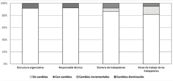 Los cambios recientes de los servicios de salud pública referidos por sus actuales responsables se presentan en la figura 3. Reflejan la situación en 2016, un año después de las elecciones municipales de mayo de 2015 y tras varios años de fuertes restricciones impuestas por las Cortes al gasto de los gobiernos locales. Se apreció una cierta estabilidad en las estructuras y en los recursos humanos, pues referían haber sufrido cambios estructurales un 5,4% de los municipios, y en un 7,4% había cambiado el responsable técnico. La plantilla y las horas de trabajo básicamente se habían mantenido, y la proporción de municipios que dijo haber sufrido una disminución en personas u horas de trabajo fue comparable a la de los que relataron un incremento.