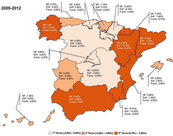 Las diferentes regiones han sido clasificadas en tres tercios, indicando los colores más oscuros aquellas regiones en las que es menor el descenso de la población fumadora durante el período 2009-2012. Se detalla el porcentaje de cambio respecto a 2009 en la población fumadora, no fumadora (NF) y exfumadora (ExF) en cada región.