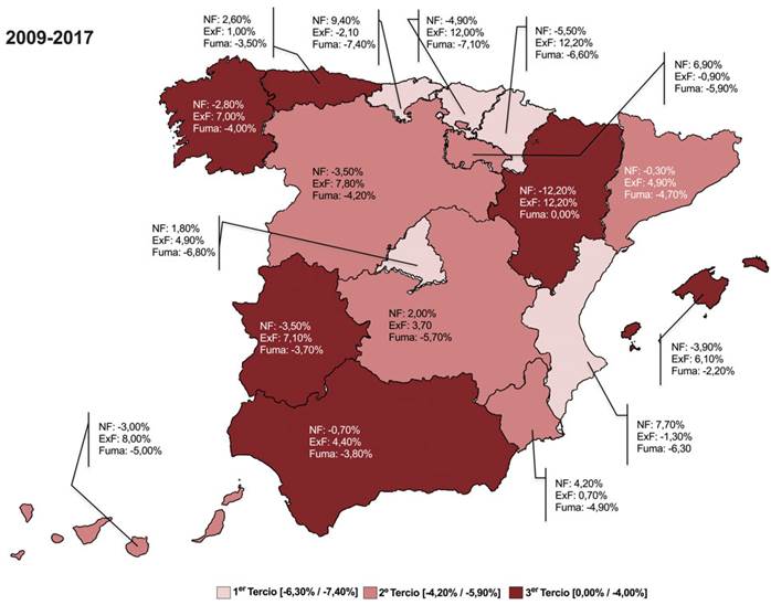Las diferentes regiones han sido clasificadas en tres tercios, indicando los colores más oscuros aquellas regiones en las que es menor el descenso de la población fumadora durante el período 2009-2017. Se detalla el porcentaje de cambio respecto a 2009 en la población fumadora, no fumadora (NF) y exfumadora (ExF) en cada región.