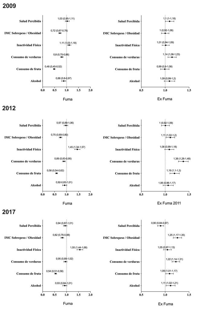 En la figura 3 se puede apreciar cómo, respecto a la población no fumadora, el consumo habitual de tabaco se asoció con un menor IMC (2009, 2012, 2017), un mayor nivel de inactividad física (2009, 2012, 2017), menor consumo de verdura (2009 y 2012) y menor consumo de fruta (2009, 2012, 2017). Respecto a la población no fumadora, las personas exfumadoras desarrollaron en los años 2012 y 2017 un mayor consumo de verdura y fruta, así como tuvieron mayor probabilidad de presentar exceso de peso u obesidad en 2012 y 2017.