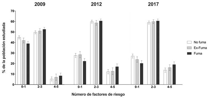Resultados: La población fumadora disminuyó un 3,13% durante el período 2009-2012, y un 4,81% durante el período 2009-2017. Para la población fumadora, la probabilidad de presentar 2 o 3 factores de riesgo reflejó un odds ratio (OR) de 1,17 (1,08-1,26), p<0,0001 en 2009; de 1,23 (1,12-1,34), p<0,0001 en 2012; y de 1,32 (1,21-1,44), p<0,0001 en 2017. La probabilidad de presentar 4 o 5 factores de riesgo reflejó un OR de 1,51 (1,31-1,74), p<0,0001 en 2009; de 1,60 (1,42-1,81), p<0,0001 en 2012; y de 1,70 (1,51-1,92), p<0,0001 en 2017. En cuanto a la población exfumadora, la probabilidad de presentar 2 o 3 factores de riesgo no fue significativa en 2009, con un OR de 0,88 (0,80-0,98), p=0,013 en 2012; y no fue significativa en 2017. En el caso de la probabilidad de presentar 4 o 5 factores de riesgo no fue significativa en 2009, con un OR de 0,86 (0,75-1,00), p=0,045 en 2012, y con 1,15 (1,02-1,30), p=0,028 en 2017.