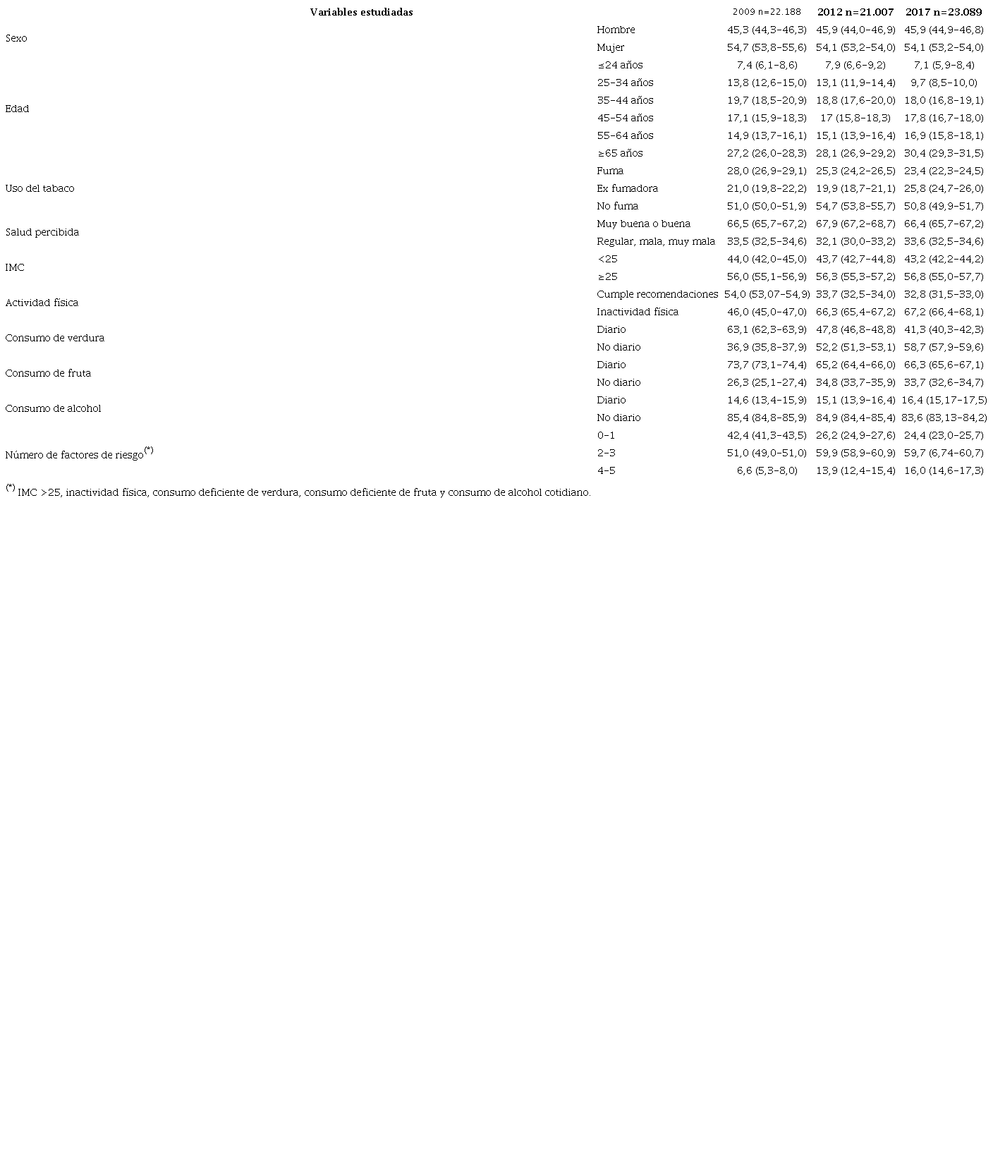 Se presentaron descriptivos básicos de prevalencia (porcentaje e intervalo de confianza al 95%) de las diferentes variables estudiadas en la tabla 1. Se examinó la agregación de cinco de las variables estudiadas (IMC, consumo de fruta, consumo de verdura, consumo de alcohol y actividad física). Respecto al consumo de tabaco, se dividió a las personas en tres grupos, en función del número de factores de riesgo para la salud que presentaban (0-1 factor, 2-3 factores o 4-5 factores). Las estimaciones fueron ponderadas para tener en cuenta el diseño muestral y, para estimar la asociación independiente de las variables estudiadas con el consumo de tabaco, se obtuvo la razón de probabilidades ajustada a sexo y edad (“odds ratio” e intervalo de confianza al 95%), mediante un análisis de regresión logística multinomial. El análisis se llevó a cabo utilizando el programa SPSS, versión 24.0.