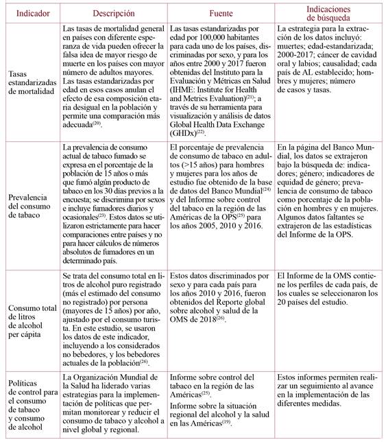 Los indicadores, fuentes e indicaciones de búsqueda se evidencian en la tabla 1.