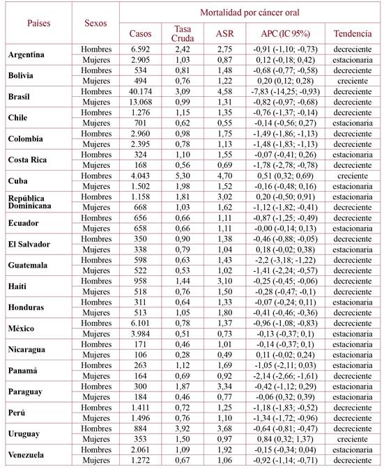 La tabla 2 muestra las tasas de mortalidad por cáncer oral por cada país y sexo, así como el porcentaje de cambio anual (APC) y la tendencia.