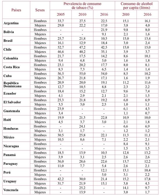 El porcentaje de prevalencia de consumo de tabaco en mayores de 15 años entre los países de América Latina mostró disminución generalizada, con excepción de las mujeres de Brasil, las cuales pasaron de un 16,1% en 2005 a un 18,4% en 2015; mientras, los hombres de este país mostraron una reducción del 25,7% en 2005 al 10,5% en 2015 (tabla 3). Los porcentajes más altos para hombres se presentaron en Cuba en los tres años de medición, con un promedio del 55%, y en las mujeres de Chile, con un promedio del 40,6%, siendo éste país el que presentó la menor diferencia entre sexos. Los porcentajes más bajos se presentaron en Panamá en 2016 tanto para hombres (10,5%) como para mujeres (2,5%).