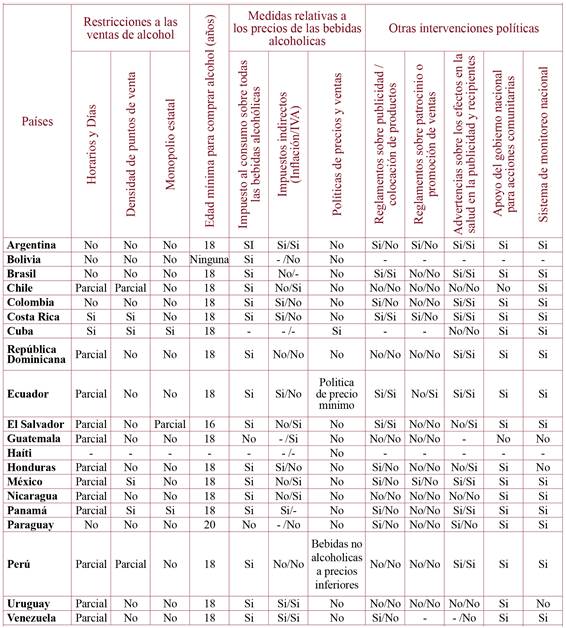 Desde 2010, el Departamento de Abuso de Sustancias de la OMS hizo de la prevención y reducción del uso nocivo del alcohol una prioridad, y creó la estrategia global para reducir su consumo. En 2011, los países miembros de la Organización Panamericana de la Salud (OPS) aprobaron el Plan de Acción para Reducir el Uso Nocivo de Alcohol (Resolución CD51.R14). Los mayores esfuerzos de las políticas impulsadas por esta estrategia para controlar el consumo de alcohol, se focalizaron en acciones para alterar los contextos para beber y en limitaciones a la disponibilidad de alcohol. Cuba, Panamá, y Costa Rica presentaron los mayores avances al restringir los horarios y días de venta, y al disminuir la densidad de puntos de venta, y los dos primeros países poseen el monopolio estatal (tabla 5). Otras medidas fueron relativas a los precios de las bebidas alcohólicas. En este sentido, Cuba se mostró firme con el control de precios, mientras los otros países revisados mostraron avances en la aplicación de impuestos al menos en dos de las medidas recomendadas19,26.