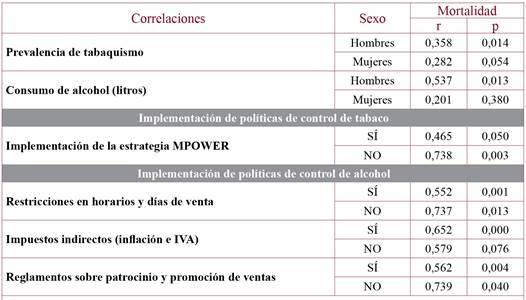 Resultados: Los mayores descensos en la mortalidad por cáncer oral fueron en los hombres de Brasil (APC -7,83; -14,25; -0,93). La mortalidad por cáncer oral mostró relación positiva entre hombres y la prevalencia del consumo de tabaco y del consumo de alcohol (r=0,358, r=0,537) (p<0,01), y entre la no implementación de las políticas de control de tabaquismo (r=0,738) (p=0,003), las restricciones en los horarios y días de venta de alcohol (r=0,737, p=0,001), y los reglamentos sobre patrocinio y promoción de venta de alcohol (r=0,739, p=0,040).