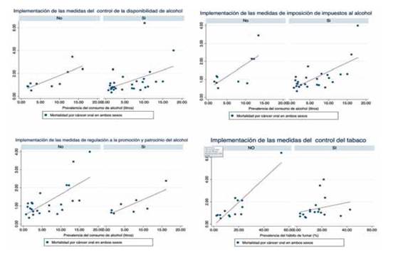 Conclusiones: El efecto de la implementación de las políticas de control se evidencia en una mayor relación con la mortalidad por cáncer oral en los países con menor avance en su ejecución.