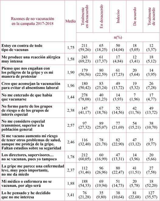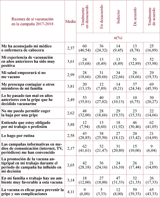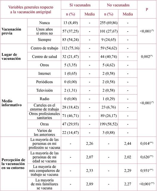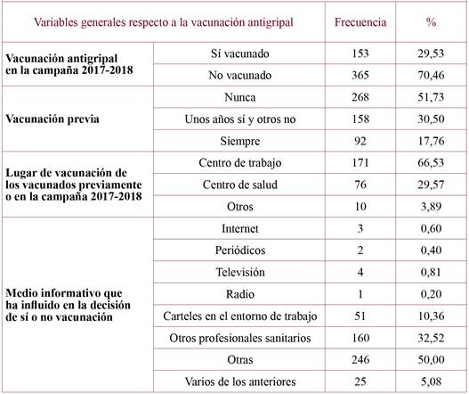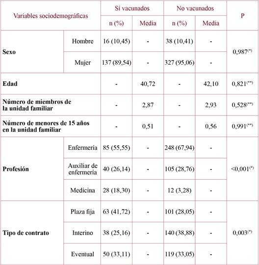 Results: The sample was formed by 518 participants, finally resulted a 29.53% vaccination rate. The principal reason for accepting the vaccine was its efficacy (average on the Likert scale of 4.11 out of 5), while the main reason for not vaccination was the lack of interest (mean=3.41 out of 5). It confirmed relationship between the type of contract and the professional category, the lower vaccination was in the temporary staff (p=0.003) and the nursing profession (p<0.001). We also found association between professionals that used to receive the vaccine in all the campaigns (p<0.001) and those who received the immunization in their workplace (p=0.002). Finally, the profession (p=0.014) and the family (p<0.001) also were influential in the decision of the immunized.