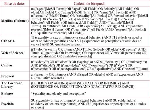 Se realizó una búsqueda sistemática de estudios publicados en inglés o castellano, hasta abril de 2018, que indagaran en las percepciones sobre la sexualidad de las personas mayores, estando tanto institucionalizadas como residentes en comunidad. La búsqueda se realizó en las siguientes bases de datos electrónicas: The Cochrane Library, Medline (Pubmed), PsycINFO, EMBASE, Web of Science, ProQuest, Cuiden y CINHAL. Asimismo, se realizó una búsqueda secundaria a través de las referencias encontradas en los estudios incluidos y en aquellos artículos sugeridos por las bases de datos relacionados con los objetivos.
