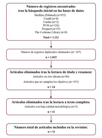 Tras la búsqueda en las bases de datos analizadas se encontraron 1.122 artículos, de los cuales 107 fueron eliminados por ser duplicados. Tras la lectura del título y el resumen, se eliminaron 86 por estar escritos en un idioma diferente al inglés o al castellano y otros 915 por no estar relacionados con el fenómeno de estudio. Tras la lectura del texto completo, se eliminaron 3 artículos por su baja calidad metodológica tras aplicar la herramienta CASPe para estudios cualitativos. Finalmente, 11 artículos fueron incluidos en esta revisión (figura 1).