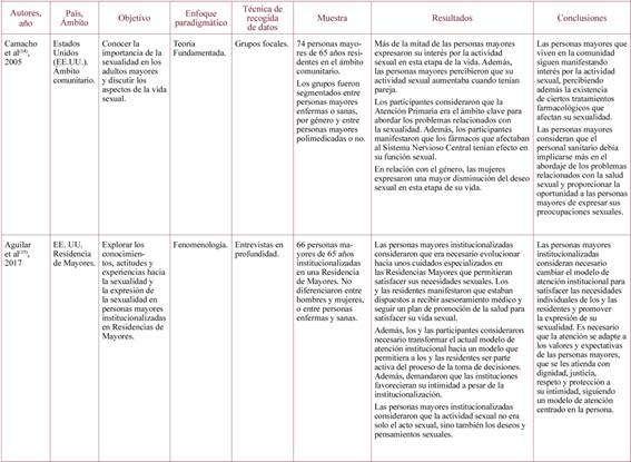 El objetivo de esta revisión fue sintetizar y analizar los estudios que indaguen en las percepciones sobre la sexualidad de las personas mayores institucionalizadas y residentes en comunidad.