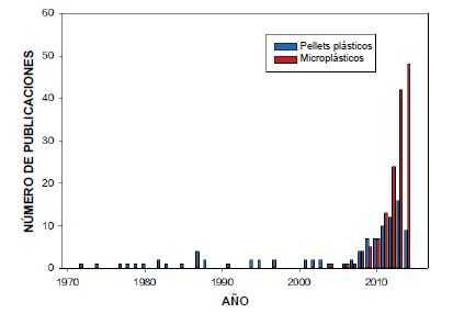Desde que empezó a usarse el término “microplástico”, la evolución del número de publicaciones relacionadas ha aumentado, como puede apreciarse en la figura 1. Esto supone un claro indicador de la aceptación del término por la comunidad científica y el aumento exponencial del número de trabajos publicados al respecto8.