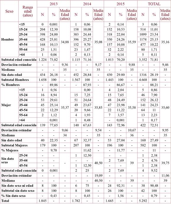 Considerando todo el período 2013-2015, se encontró una mayor proporción de consumidores de cannabis (p=0,024), cocaína (p=0,002) y MDMA (p=0,007) entre los hombres, una mayor proporción de consumidores de metadona entre las mujeres (p=0,0001) y diferencias no significativas en el consumo de heroína y anfetamina en relación con el sexo (figura 2).