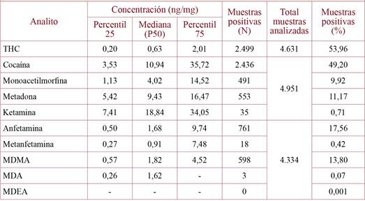En la tabla 2 se muestran los percentiles 25 y 75 que delimitan estos rangos en la población estudiada, así como los valores de las medianas. THC y MAM fueron las únicas sustancias cuyas distribuciones de concentración en cabello mostraron diferencias significativas a lo largo del período estudiado.