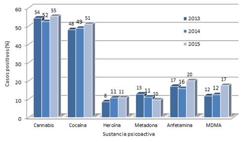 El cannabis fue la droga más consumida, con una proporción de consumidores del 54% en el conjunto del período 2013-2015 (tabla 2). La prevalencia del consumo de cocaína superó el 49%. La anfetamina y la MDMA mostraron valores muy inferiores, del 17% y 14% respectivamente. La heroína y la metadona presentaron prevalencias similares entre sí, del 10% y 11%. La ketamina y la metanfetamina tuvieron prevalencias menores del 1%, la MDA no alcanzó el 0,1% y no se detectaron casos de consumo de MDEA.