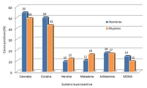 La prevalencia del consumo de cocaína es particularmente alta (49%) entre la población sometida a análisis de drogas en el cabello en el contexto forense, y está cercana a la del cannabis (54%), la sustancia más consumida entre las diez analizadas. Si bien no son poblaciones comparables, la similitud de la prevalencia de ambas drogas contrasta con los datos de la población general, donde el consumo de cannabis (6,6% durante los últimos 30 días en 2013) superó en más de seis veces al de cocaína (1%)22.
