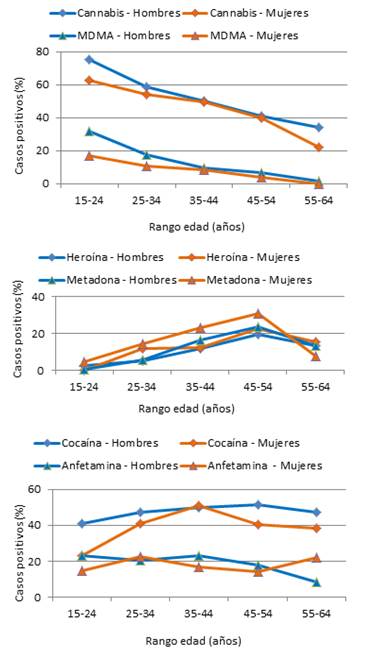 Las diferencias de consumo de cocaína, heroína y metadona en relación con la edad son significativas en ambos sexos, en las personas inmersas en procedimientos judiciales. Sin embargo, en el caso del cannabis y la MDMA sólo son significativas en los hombres. La heroína y la metadona muestran un aumento progresivo de la proporción de consumidores al aumentar la edad, alcanzando un máximo en el grupo de edad entre los 45 y los 54 años. Por el contrario, el cannabis y la MDMA muestran la mayor proporción de consumidores en el grupo de edad más joven (entre 15 y 24 años) y una disminución continua de la prevalencia al aumentar la edad.