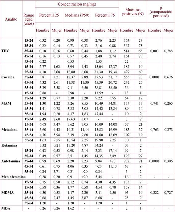 Se observó mayor concentración de cocaína en los hombres (Md=11.48 ng/mg) que en las mujeres (Md=7.41 ng/mg) (p=0.002). En los hombres hubo diferencias significativas en relación con la edad (p=0,0001). Así, los niveles de cocaína fueron inferiores en el grupo más joven y presentaron valores máximos en los grupos entre 25 y 44 años. Entre las mujeres, las diferencias no fueron significativas (tabla 3).