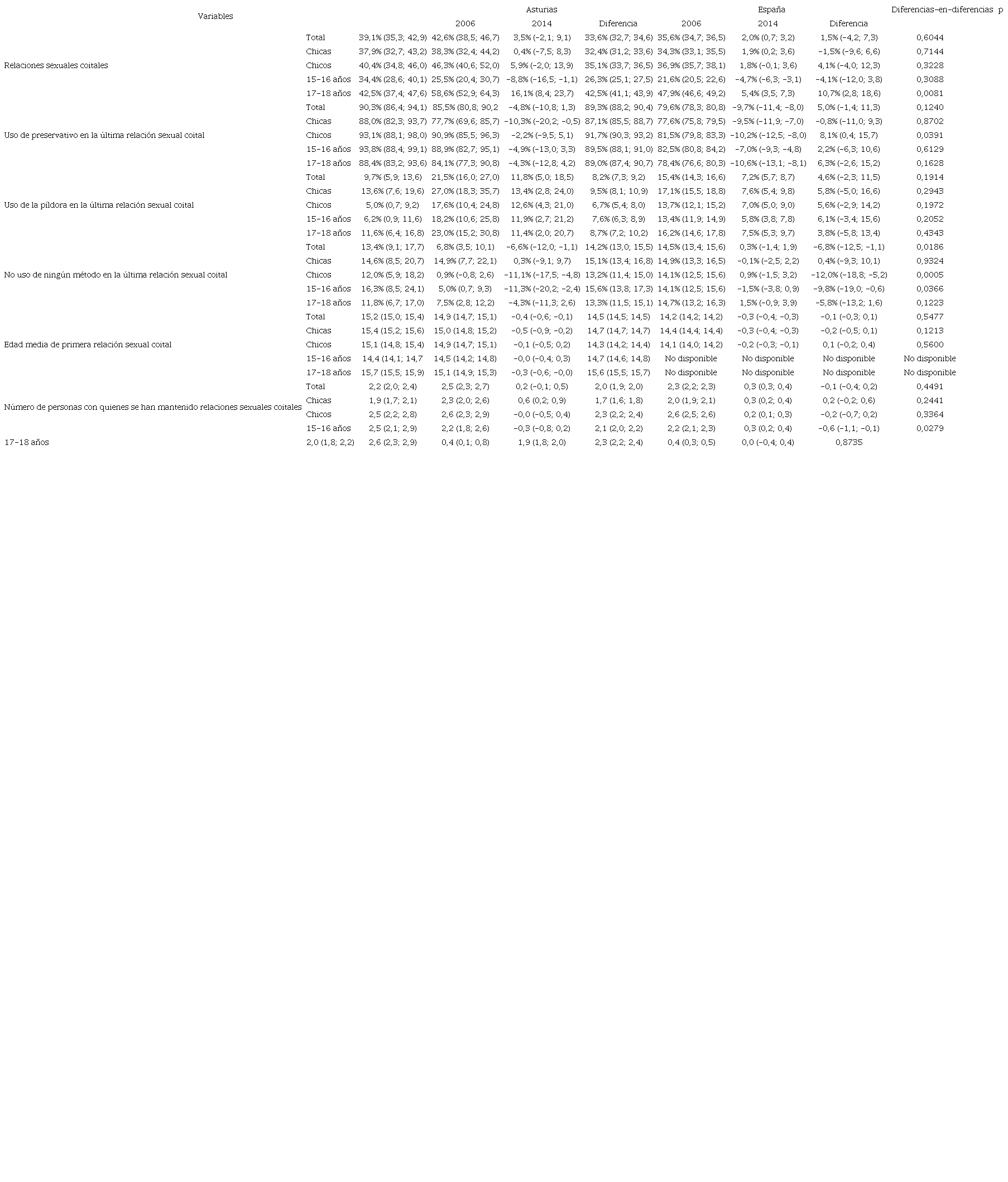 Hubo un aumento del porcentaje de población adolescente que declaró haber mantenido relaciones sexuales coitales entre 2006 y 2014 (del 39% al 43% en Asturias y del 34% al 36% en España), sin diferencias significativas en la evolución de los dos grupos (p=0,60).