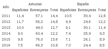 En el análisis por nacionalidad, hubo el mismo descenso en las mujeres españolas en Asturias y España (34%), con tasas de IVE también similares en 2016 (7,5 en Asturias y 7,0 en España). En las mujeres de nacionalidad extranjera, la tasa de IVE aumentó un 16% en Asturias mientras que en España se redujo un 20%.