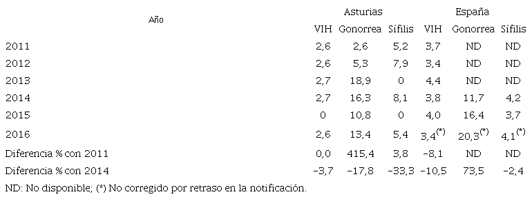 En Asturias, las tasas de VIH, gonorrea y sífilis descendieron, en el periodo 2014-2016, un 4%, un 18% y un 33%, respectivamente. En España, bajó la tasa de VIH (-11%) y la de sífilis (-2%), mientras que la de gonorrea aumentó (+74%). Si se toma el 2011 como año inicial para la comparación, las tasas se mantuvieron o aumentaron en Asturias (más de un 400% la de gonorrea) mientras que en España, la tasa de VIH (única disponible para la comparación) descendió un 8% (pendiente de retraso en la notificación).