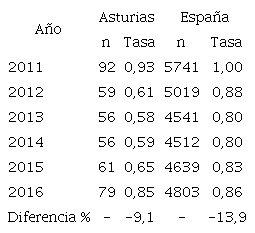 Con las tasas disponibles, se comparó la evolución con el cálculo de la diferencia porcentual de incremento o descenso de esa tasa entre el primer y último año de estudio, asumiendo la misma estructura de edad y sexo en Asturias y España.