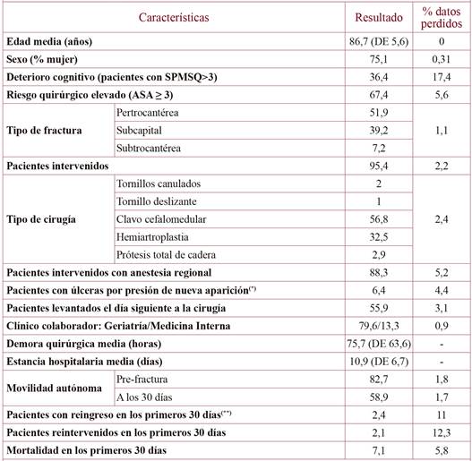Methods: We included persons 75 years or older treated for fragility hip fractures in any of the centers participating in the RNFC between January and October 2017. The descriptive statistics of each variable used the mean (and standard deviation) or the median (and interquartile ranges) for the ordinal variables and the percentage for the categoric variables. A descriptive analysis of the casemix was performed and compared with available data from the aforementioned studies.