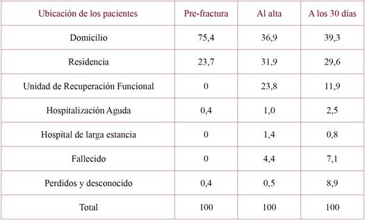 En la tabla 3 se presenta la ubicación de los pacientes incluidos en el Registro Nacional de Fractura de Cadera antes de la fractura, tras el alta y a los 30 días del alta. Uno de cada cuatro (23,7%) vivían en residencias de personas mayores antes de fracturarse. De las personas que residían en un domicilio (75,4%), el 37% volvieron a él tras el alta hospitalaria y el 39,3% lo hizo al mes de la fractura. El 23,8% de las personas registradas en el RNFC fueron derivadas a unidades de recuperación funcional al alta de la hospitalización aguda. La mortalidad al mes de la fractura fue del 7,1%.
