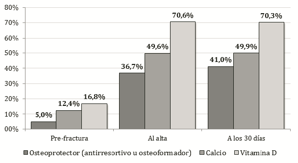 El porcentaje de pacientes con tratamiento antiosteoporótico al alta osciló entre el 14,5% (Castilla y León) y el 36,7% (RNFC).