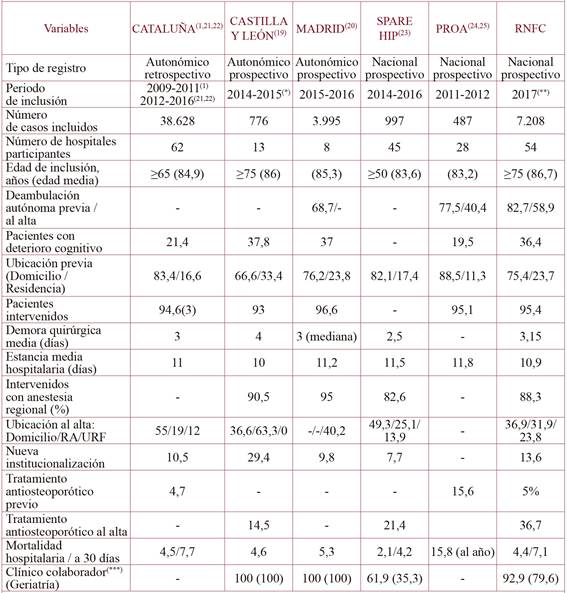 Conclusions: The RNFC is the largest prospective database to date that offers data regarding the characteristics of patients hospitalized for hip fractures in Spain. Comparison with recent studies showed some important differences.